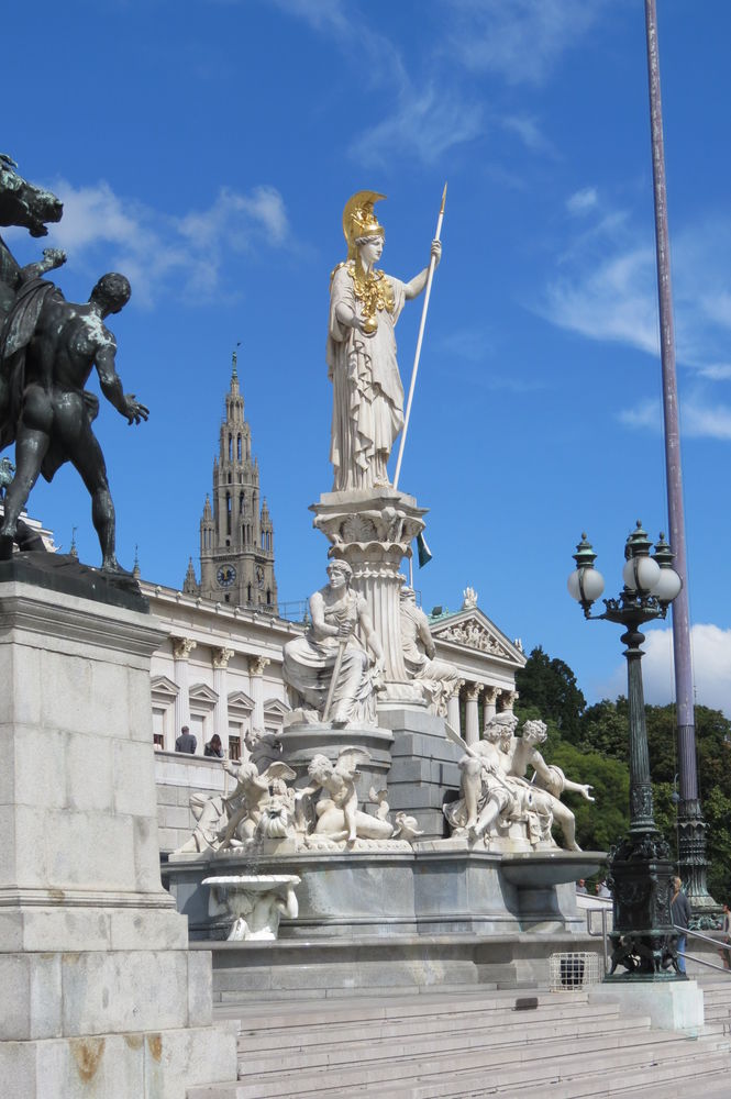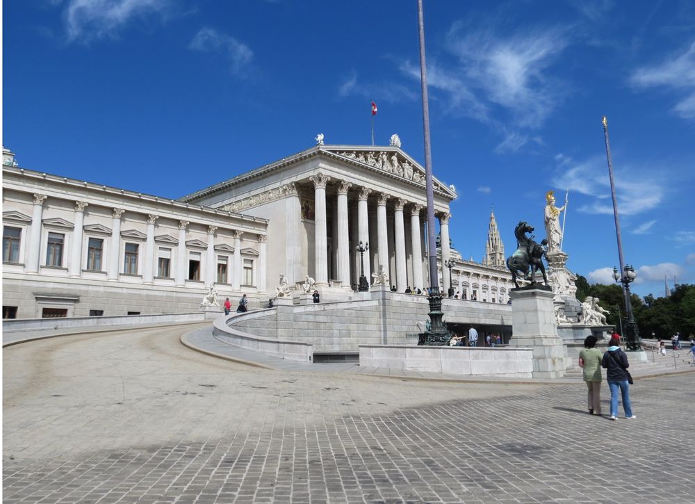 Оставив машину возле гостиницы мы пересели на трамвай и поехали в исторический центр. Город долго удивлял нас такими же длинными и скучными улицами. однако скоро все изменилось. Мы въехали в центр. Первой же достопримечательностью, которую мы увидели было здание Венского парламента, — одна из визитных карточек города.