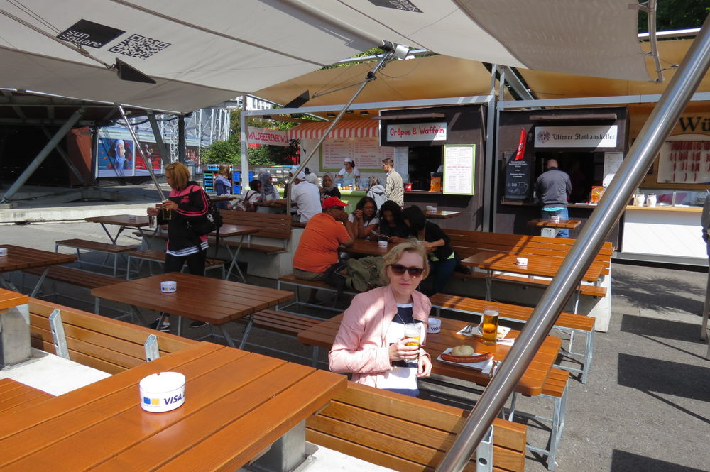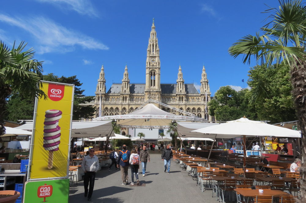 И само здание Ратуши в готическом стиле, усыпанное цветами и вот эти бесконечные скамейки и площадь с мини-кухнями мне кажется всех народов мира! Боже, какие запахи там стояли! Однако, мы решили все же раз мы в Вене, остановится на шикарной сосиске с баварской горчицей, которая была очень вкусной!). И я не особенный любитель пива, но здесь не пожалела, что попробовала!)