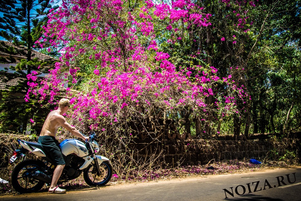 Ну все вырвались мы из этой толпы, идем к государственному такси, но тот тоже заряжает очень больную цену, надеясь обмануть нас, но мы сбиваем ее как нам надо, и едем довольные, рассматривая, не знакомые пейзажи и маленькие деревушки. Обгоняющие местные жители на своих скутерах и байках, заметив меня, улыбаясь, кивают головами, машут руками, так как меня, не сложно заметить в толпе, я белый как сыр пармезан. Дороги тут очень узкие, и порой двум машинам на одной дороге очень тяжело разъехаться. Проезжая деревни, ты понимаешь, то что цивилизация сюда добралась совсем недавно, тут нет никакого намека на пафос и гламур. На дорогах красная гоанская пыль, на обочинах опавшие листья, растущих вдоль дороги деревьев, и частенько встречаются коровы блуждающие вдоль дороги.