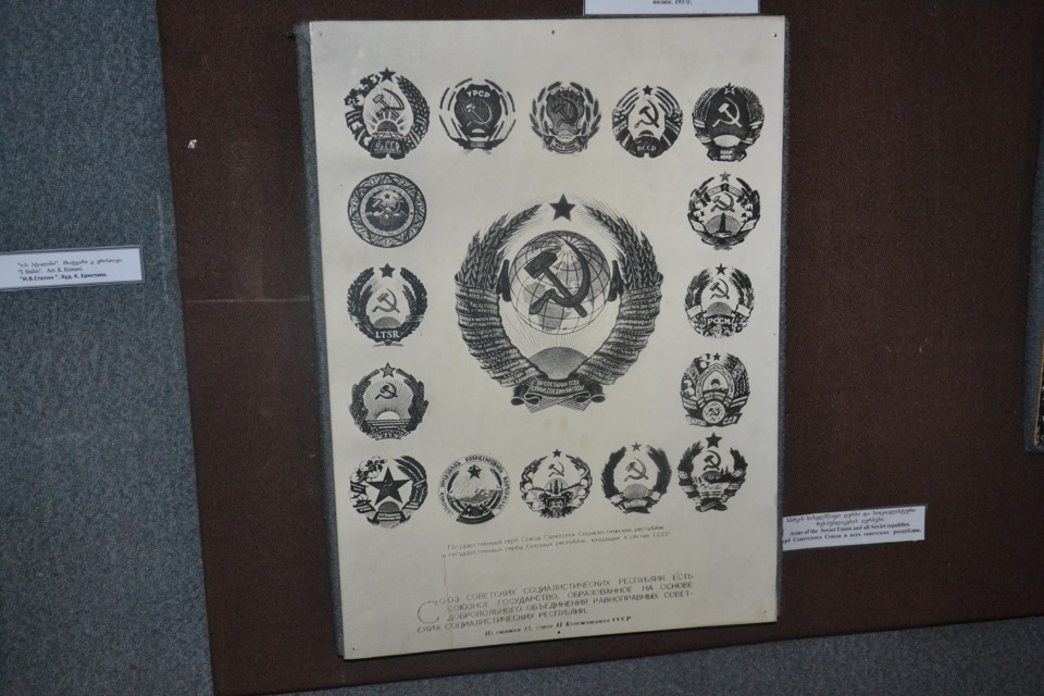 Остальное пространство завешано фотографиями и распечатаными на принтере цитатами Сталина на русском языке. Тут же подарки, которые ему вручали на юбилеи в 1939 и в 1949 годах. Экспозиция завершается его посмертной маской.