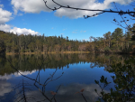 Утром втроем с Антоном и Настей выдвинулись на хребет в направлении г. Пятачок, которая венчает хребет прямо над озером Сатурн. Заросшую вершину траверснули, в седловине нас догнали остальные ребята налегке. Оказалось, пойдя по волоку, мы сделали крюк по хребту, они же подрезали его по распадку. К слову, на спуске в распадке нашелся красивый ручей и приличное подобие звериной тропы вдоль него.