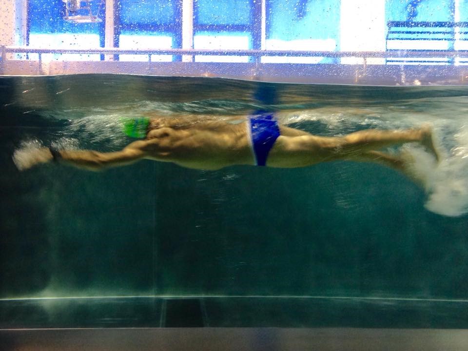Видеосъёмку техники плавания провели в специальной гидротрубе с противотоком. Каждому спортсмену задается своя скорость потока, её можно уменьшать или увеличивать по желанию. Съёмка ведётся одновременно с трёх камер, изображение тут же транслируется на экран и тренер может на примере плывущего товарища указать на ошибки. Можно спуститься этажом ниже и наблюдать за пловцом в аквариуме. Завораживает J Интересный опыт, но сам по себе результатов не даст, конечно. Нужно анализировать и потом плотно работать над ошибками. Мы со своими спортсменами взяли на вооружение.