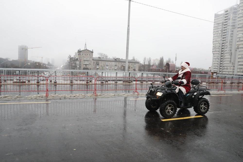 В субботу, 28 декабря, Шулявский мост после ремонта открыли для автомобилей. Виталий Кличко первым проехал по путепроводу в костюме Деда Мороза на квадроцикле.