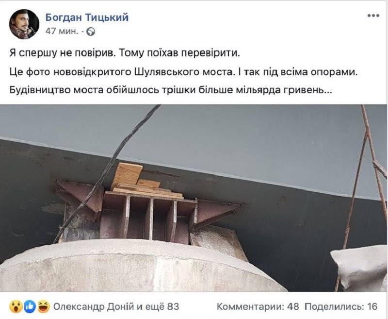 «Я сначала не поверил. Поэтому поехал проверить. Это фото новооткрытого Шулявского моста. И так во всем опорами. Строительство моста обошлось чуть больше миллиарда гривен…», — написал Богдан Тицкий в Facebook.