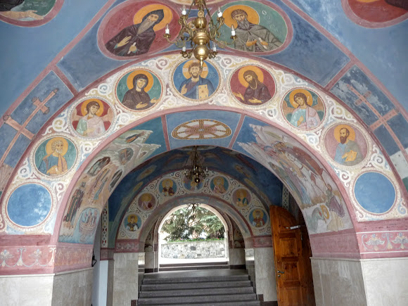 К Свято-Успенскому собору нужно пройти через арочные своды с росписями ликов святых.
