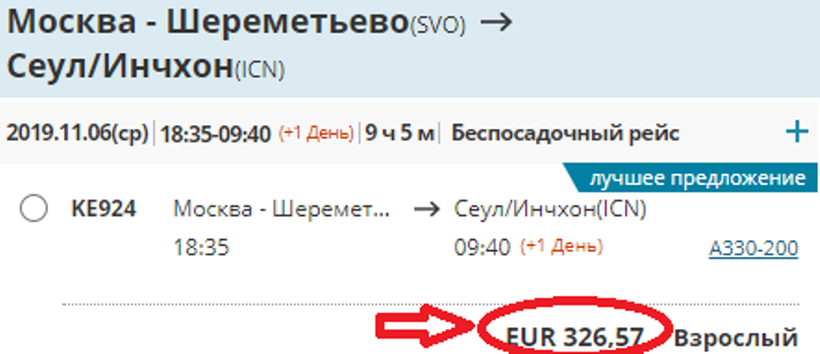 | KE-924 | Korean AIR | 18:55 | Москва | 8 часов 45 минут | 09:40 | Сеул |